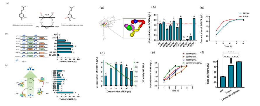 郑璞教授团队成功地利用了源自铜绿假单胞菌(Pseudomonas aeruginosa)的4-羟基苯乙酸3-羟基化酶(4HPA3Hs)催化阿魏酸合成5-羟基阿魏酸。然后通过优化了氧化酶组分(PaHpaB)和还原酶组分(PaHpaC)的共表达以及全细胞催化条件的优化,工程菌株BC将2g/L 的FA的产率从39%提高到75%。通过对PaHpaB进行通道工程,获得的突变体F301A和Q376A几乎完全转化了2 g/L的FA。进一步地,多重突变体L214A/F301A/Q376A在12小时内将4 g/L FA转化为5-OHFA,产率达到99.9%,比野生型高出约2.39倍。L214A/F301A/Q376A的kcat/Km值约为野生型的307倍。对三维结构模型的分析表明,L214、F301和Q376突变为Ala,极大地缩短了氨基酸的侧链并拓宽了通道尺寸,从而显著提高了L214A/F301A/Q376A的催化效率。这种5-OHFA的生物合成方法简单、高效、绿色,表明其可用于多酚类化合物的高效生物合成。