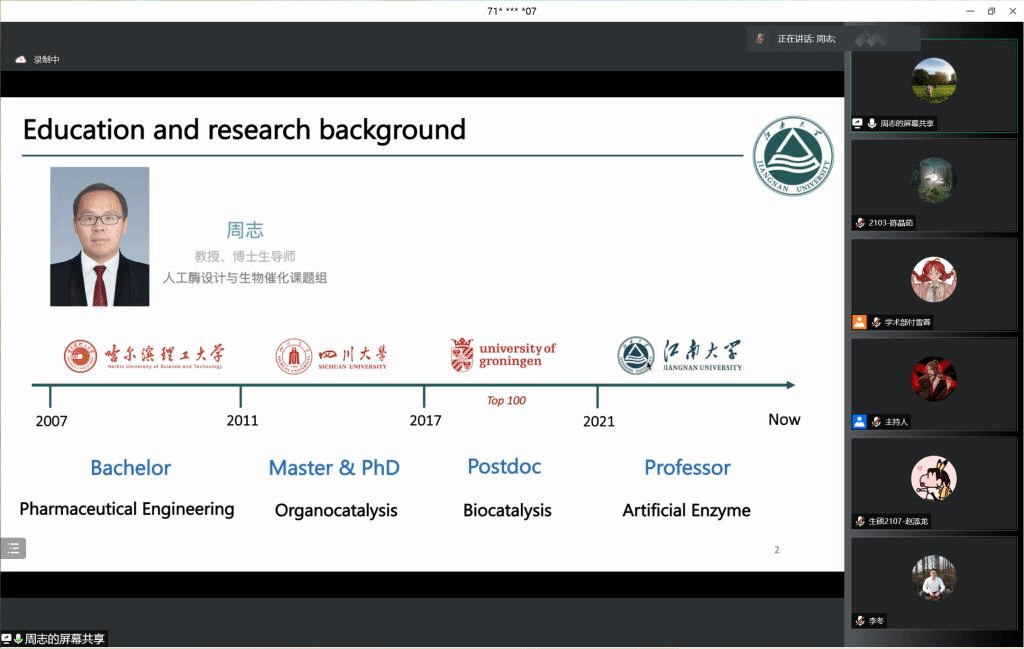 主讲人周志教授,于2021年加入88038威尼斯检测中心开展独立科研工作,主要研究方向为新型人工酶设计与催化,致力于发展酶催化的非天然反应研究。至今以第一或通讯作者身份在国际著名期刊Nature Catalysis, Nature Chemistry,ACS Catalysis, Angew. Chem. Int. Ed.等上发表研究论文数篇。目前负责“合成生物学”重点专项青年项目子课题一项。