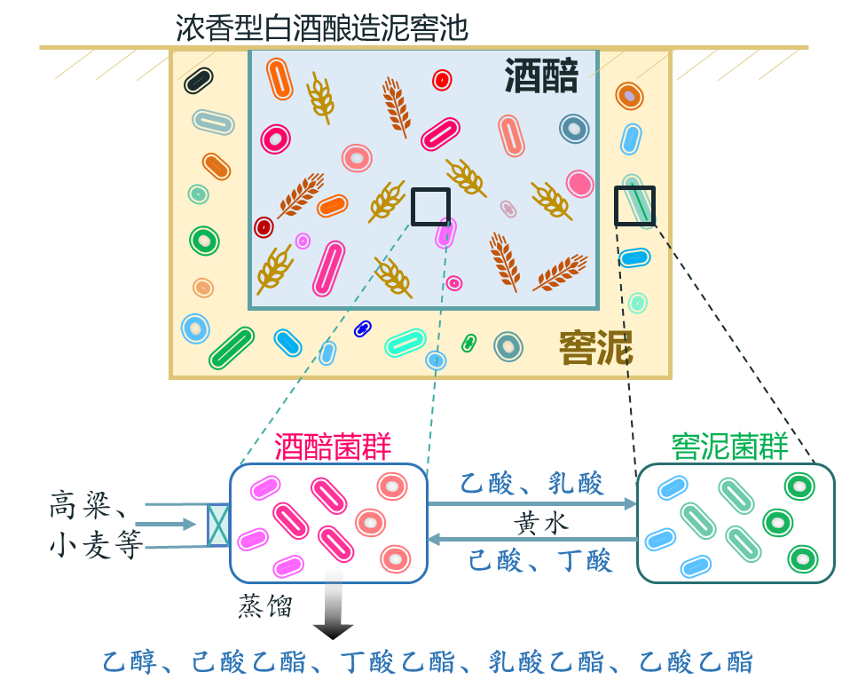 泥窖酿酒是浓香型白酒最具特点的工艺特征,是我国劳动人民数百年实践经验的总结与结晶。泥窖池内网罗了来自原料、大曲、窖泥和环境等的微生物,形成了高度复杂多样的酿造微生物集群。在窖池内,酒醅与窖泥是酿造微生物的天然栖息地,然而,发酵过程这些微生物在浓香型白酒典型风格形成中的协作机制有待解析。